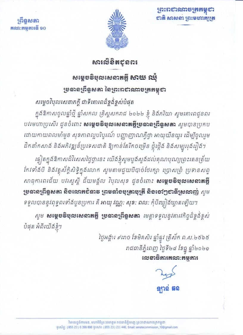 សារលិខិតជូនពរ សម្តេចវិបុលសេនាភក្តី សាយ ឈុំ ប្រធានព្រឹទ្ធសភា នៃព្រះរាជាណាចក្រកម្ពុជា